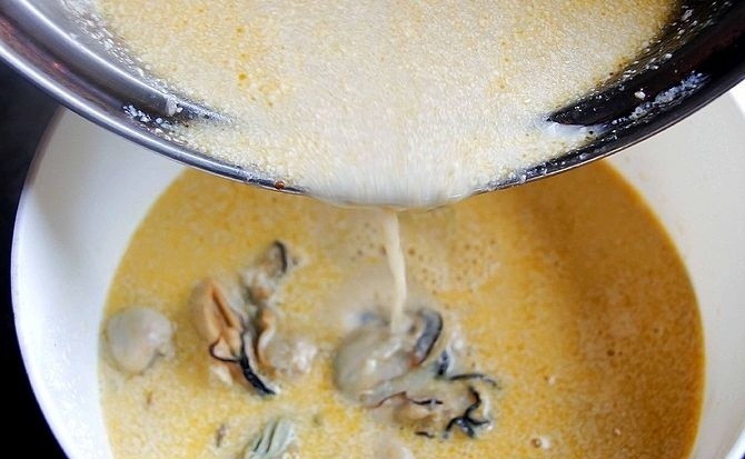 ضيفي بلح البحر و تركه علي النار حتي يغلي علي النار و تبدأ الحواف في التشكيل كما هو موضح أمامك .
